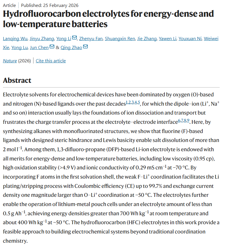核心突破:该团队在电池电解液领域取得重大突破。他们打破了传统电解液依赖锂-氧配位的方式,创新性地设计并合成了一系列新型氟代烃溶剂分子,构建了基于“氟配位”的新型电解液体系。