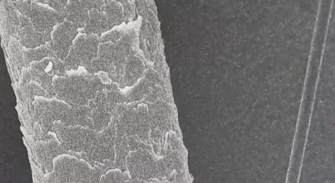 △放大800倍的头发丝(左)与T1200级碳纤维(右)。