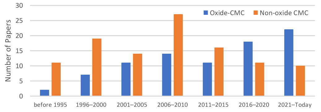从图可以明显看出,研究人员的关注点已从非氧化物基陶瓷基复合材料逐渐转向氧化物基陶瓷基复合材料。总体而言,诸如提高工作温度、引入更简便且成本效益更高的制造工艺、改善陶瓷基复合材料热性能等成果,吸引了更多研究人员投身于该领域的研究。