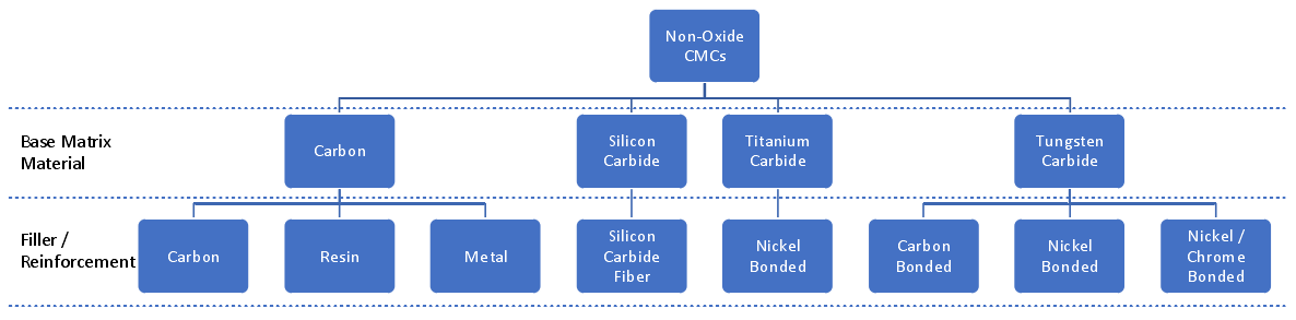 最常用的结构非氧化物材料是碳化硅,也称为赛隆,它是一种基于氮化物的陶瓷,含有多种氧化物成分。通常在高温惰性气体环境中对其进行加工,以减少氧化。非氧化物陶瓷基复合材料的成分包括不同的基体(可用作基础材料)以及不同的填料和增强材料,如图 所示。四种主要的材料基体为碳、碳化硅、碳化钛和碳化钨。
