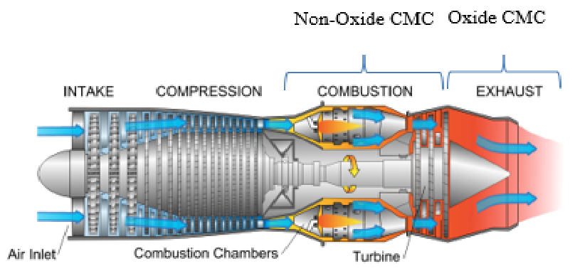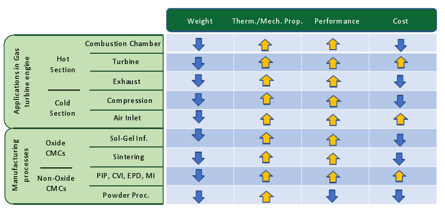 根据文献,航空航天技术贡献的三分之一用于提高涡轮进口温度(TIT)材料性能,更具体地说,用于通过定向凝固和单晶技术制造的镍基高温合金。航空航天技术贡献的其余部分用于引入涡轮叶片、叶片的内部冷却通道以及冷却技术的进步。近年来的研究表明,陶瓷基复合材料在涡轮进口温度方面的热效率和功率输出超过了要求,使其适用于旋转(喷嘴、叶片、涡轮叶片)和固定的涡轮发动机部件。因此,航空航天公司开始使用这些制造技术在燃气涡轮发动机的冷端和热端部件中制造陶瓷基复合材料部件。不过必须指出,陶瓷基复合材料的商业化需要更多努力,因为一些最常见的制造工艺比其他类型的高温合金成分技术成本高得多,如化学气相渗透(CVI)和聚合物浸渍热解工艺。