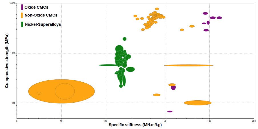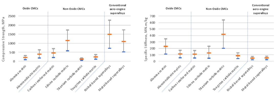图 8:现有陶瓷基复合材料的抗压强度和比刚度与高温合金的比较