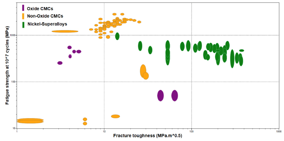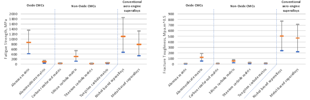图 10:现有陶瓷基复合材料的疲劳强度(10^7 次循环)和断裂韧性与高温合金的比较