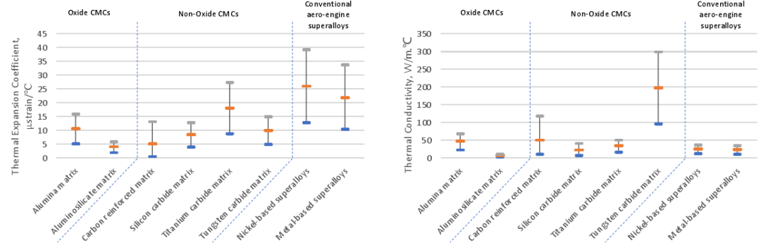 正如博耶等人所指出的,用于航空发动机的材料需要控制热机械加工条件,以尽量减少材料缺陷。图 11 和图 12 比较了现有氧化物和非氧化物陶瓷基复合材料以及航空发动机中使用的传统高温合金的热膨胀系数和热导率。这两个热性能在选择用于高温应用(如航空发动机)的材料时都受到高度重视。热膨胀系数用于评估材料在高温和恒定压力下的尺寸变化,而热导率则表示材料传导和传递热量的能力。热膨胀系数和热导率的结果越低,材料在高温应用中的吸引力就越大。从图 12 中可以看出,在热膨胀系数方面,所有陶瓷基复合材料的性能都优于高温合金,这表明由陶瓷基复合材料构成的结构将提供更高的热稳定性和刚性。在热导率方面,大多数陶瓷基复合材料的性能与传统高温合金相似。铝硅酸盐基体复合材料的热导率系数最低,而碳化钨基体陶瓷基复合材料则处于另一个极端。这意味着在为部件选择碳化钨基体陶瓷基复合材料时,可能需要额外考虑对部件进行冷却的问题(例如,可以通过使用内部冷却通道来实现)。文献综述表明,铝硅酸盐陶瓷基复合材料,尤其是 Nextel 720 机织织物,具有最低的热导率和热膨胀系数。
