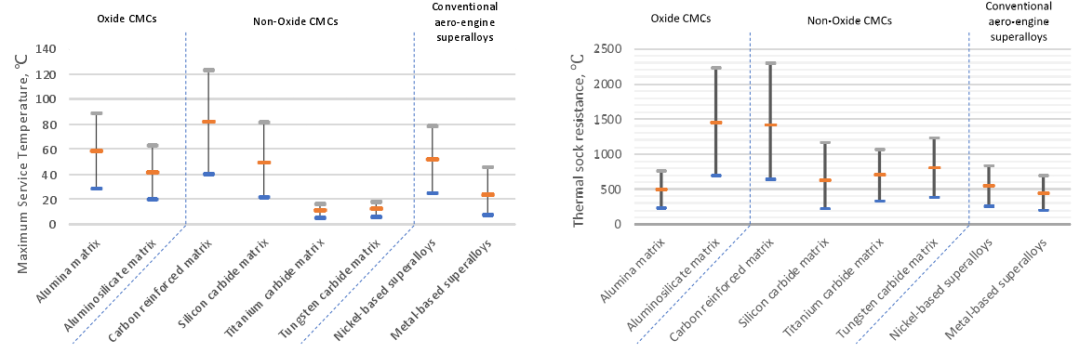 图 13 和图 14 比较了现有氧化物和非氧化物陶瓷基复合材料与传统高温合金的最高使用温度和热震抗性。最高使用温度用于评估材料在不失效的情况下能够使用的最高工作温度,热震抗性则表示材料能够承受的温度变化幅度,而不会造成任何界面损伤甚至灾难性失效。根据研究,由于航空发动机应用中存在瞬间温度变化,因此需要材料具有较高的热震抗性。铝硅酸盐氧化物基体,尤其是 Nextel 720 机织织物,具有更好的综合性能,它们能够承受高于 1000°C 的温度和超过 700°C 的热震抗性。另一方面,碳纤维增强碳基体复合材料具有最高的使用温度和最高的热震抗性,超过了航空发动机中使用的高温合金的性能。