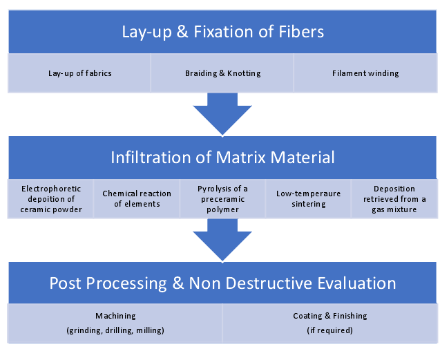 陶瓷基复合材料的加工过程可分为三个步骤,每种陶瓷基复合材料都需要经过这些步骤,以获得所需的机械、热和物理性能。第一步是根据所需部件的几何形状铺设和固定纤维。第二步是基体材料的浸渗,这一步包括五种不同的工艺,用于填充纤维和预成型件之间的陶瓷基体。这些浸渗工艺包括在较低温度(1000 - 1200°C)下烧结、陶瓷前体聚合物的热解、元素的化学反应、从气体混合物中沉积以及最后陶瓷粉末的电泳沉积。非氧化物陶瓷基复合材料通过从气体混合物中沉积、陶瓷前体聚合物的热解或元素的化学反应来制造。氧化物陶瓷基复合材料则通过烧结或陶瓷粉末的电泳沉积来制造。第三步也是最后一步是加工,如果需要的话,还包括对内部孔隙进行涂层或浸渍。在以下段落中,将回顾最常用的制造工艺。