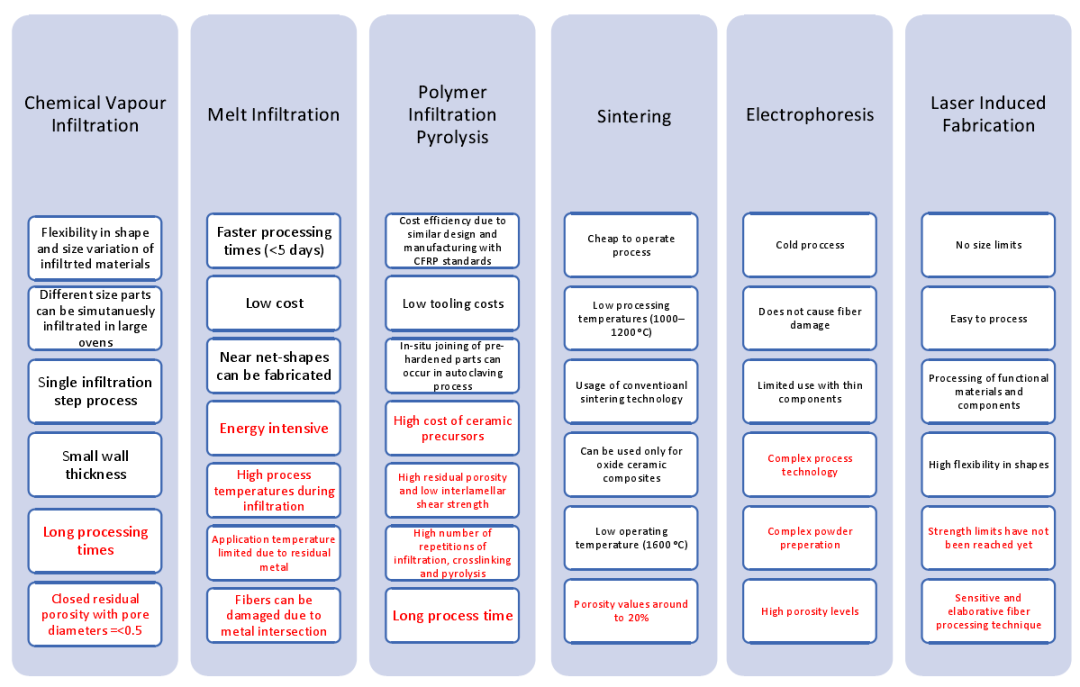 根据本节中引用的文献,用于陶瓷基复合材料的主要制造工艺包括化学气相渗透、聚合物浸渍、热解和热压烧结技术。聚合物浸渍和热解是最常用的方法。主要目标是能够控制所制造陶瓷基复合材料的热和机械性能,但几个因素非常重要,例如最终形成相的分布以及从复合材料合成开始所应用的加工路线。这些方面可以通过正确选择复合材料制造工艺来进行调整。每个工艺都有不同的优缺点,如图 16 所示。