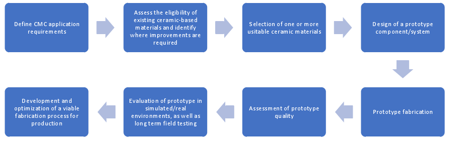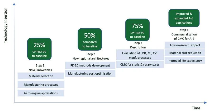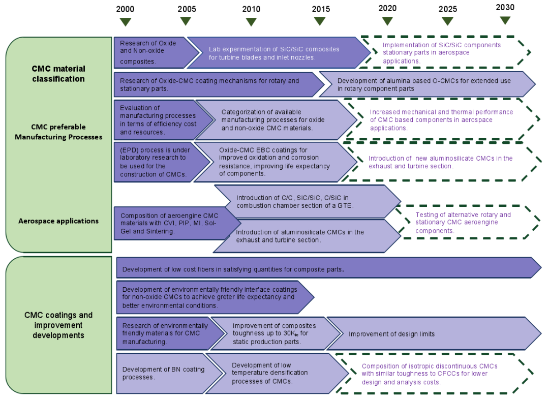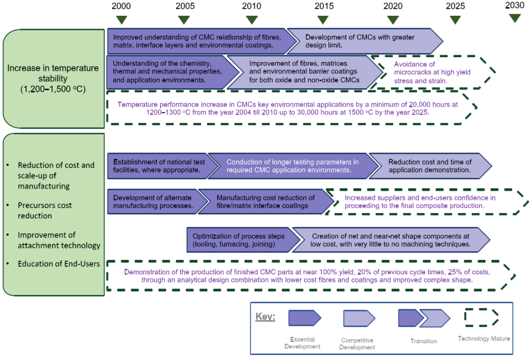 路线图提出了关于陶瓷基复合材料在航空航天和涡轮发动机应用中使用的几个重要发展目标。它们可以分为不同的研究小组,这些小组有助于陶瓷基复合材料在航空航天工业中的可持续发展和增长。这些小组包括具有更优异和创新性能的新型陶瓷、先进的加工技术以及用于航空航天应用的高性能旋转和静态部件。此外,根据文献,这些发展目标自 20 世纪 90 年代初就已开始研究和推进,预计到 2030 年完成。