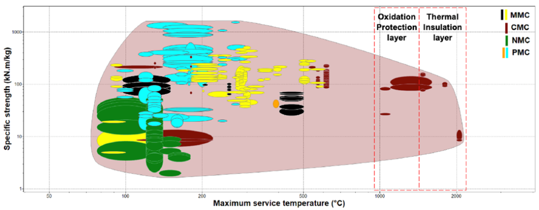 图 14:陶瓷基复合材料的最高使用温度和热震抗性的比较